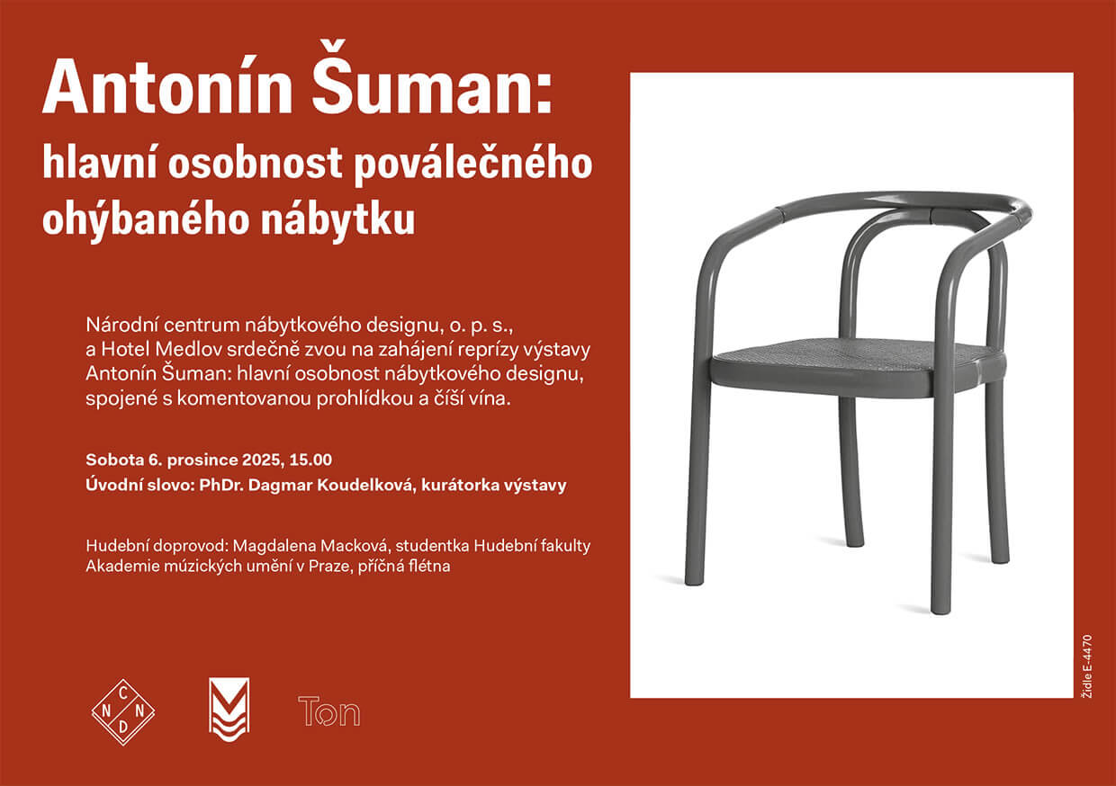 Srdečně Vás zveme na reprízovanou vernisáž výstavy Antonín Šuman: hlavní osobnost poválečného ohýbaného nábytku, které ve spolupráci s Národním centrem nábytkového designu, o. p. s. pořádá Hotel Medlov. V průběhu vernisáže se můžete těšit na komentovanou prohlídku a úvodní slovo kurátorky výstavy, PhDr. Dagmar Koudelkové. Vernisáž doprovodí číše vína a hudební vystoupení na příčnou flétnu studentky Hudební fakulty Akademie múzických umění v Praze Magdalény Mackové.